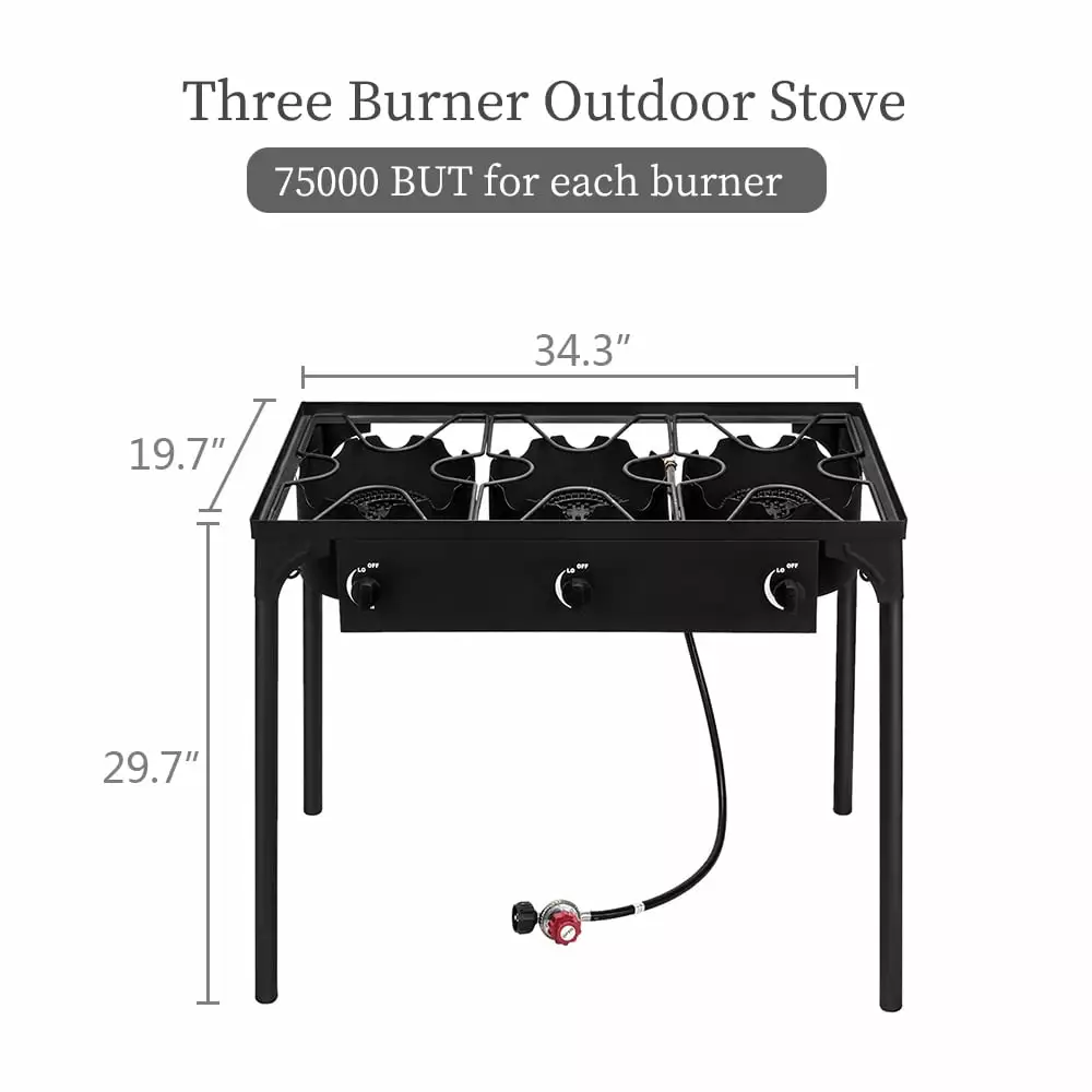 From its powerful performance to the sturdy design. this portable camp stove is your go-to companion for creating memorable meals in the great outdoors. POWERFUL THREE BURNER STOVE: Experience the ultimate outdoor cooking with this high-pressure propane gas cooker. Equipped with a sturdy cast iron head. it delivers an impressive 225.000 BTU of cooking power. Adjust the firepower for delicious outdoor meals with family and friends.