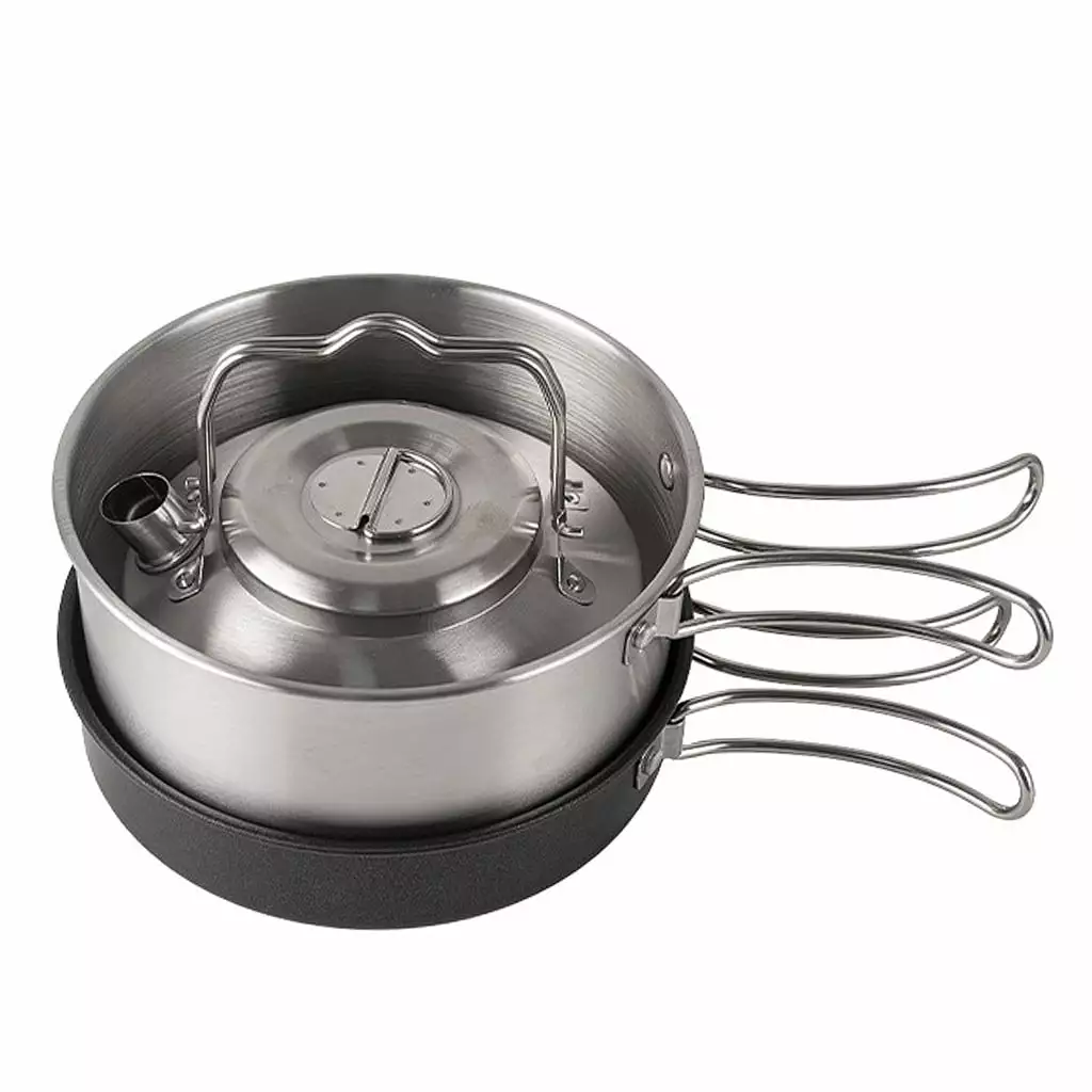 - All-in-One Cookware: This outdoor cookware set includes two pots and a kettle. a big pot and a small pot. They can be heated. fried. boiled. fried. boiled water. cooked noodles. etc.